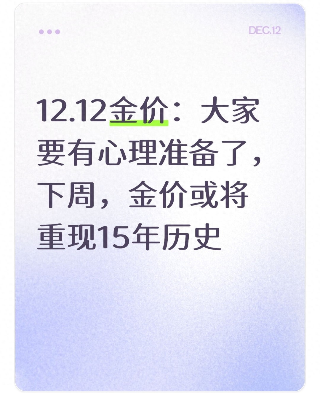 清晨6点,天还没亮,黄金市场的暗流已经开始涌动。12月11日刚上演完“国际金价回调、国内金店逆势涨价”的割裂戏码,12日开盘前,一个关键信号已经浮出水面:下周金价,很可能会复刻2015年的历史行情。不管是准备买三金的新婚夫妻、想囤金条的普通家庭,还是关注黄金市场的观望者,现在都得绷紧神经——这波行情的波动,可能远超你的想象。